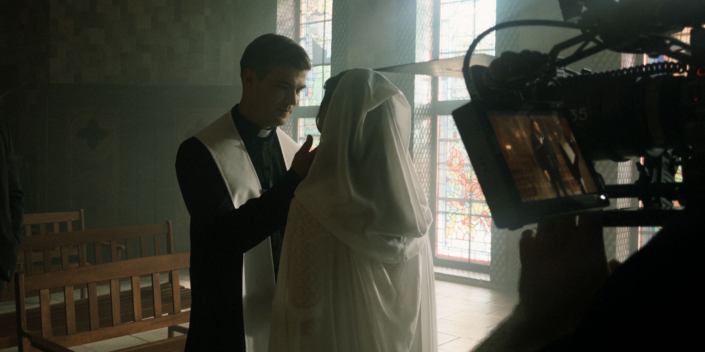 A quiet but emotional moment between Maksym Samchyk (Father Christopher Crow) and Oleksandra Pankova (Lisa Stone) near the end of the story. | Source: AMO Pictures